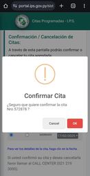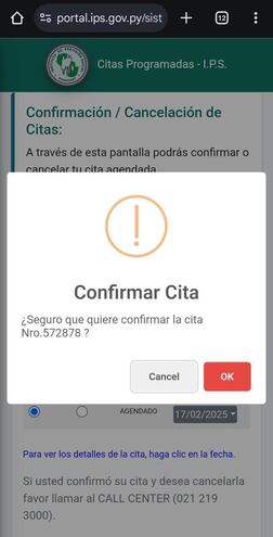 El IPS enviará al asegurado con cita médica agendada, un mensaje de texto a su celular registrado en el sistema, desde el número (0962) 152-152. Se pide a los aportantes del seguro social, estar atentos al mensaje y confirmar la asistencia o cancelar la cita, para evitar contratiempos posteriores.