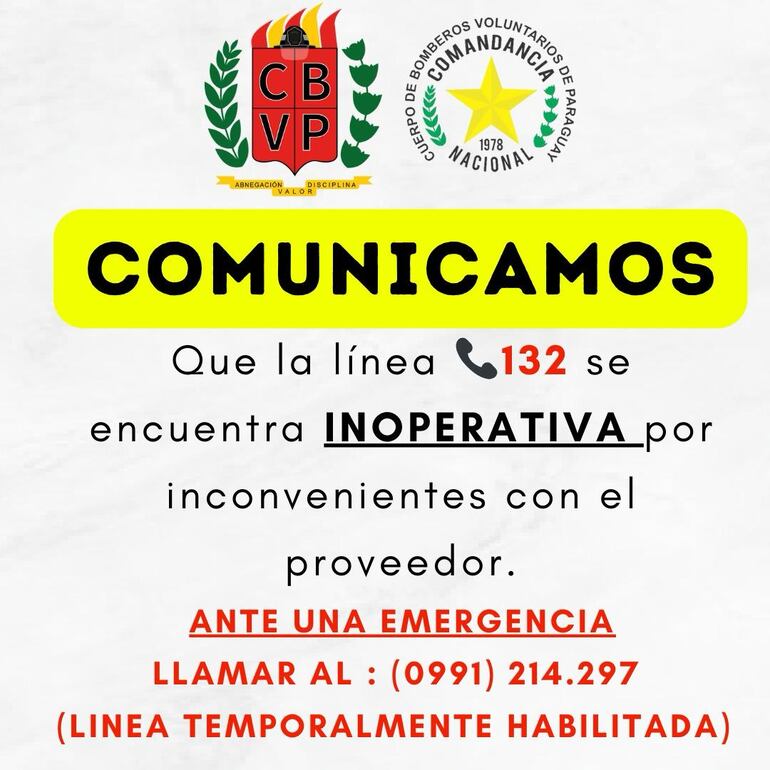 Desde el Cuerpo de Bomberos Voluntarios del Paraguay (CBVP) informaron este viernes que la línea telefónica 132, utilizada para reportar emergencias, se encuentra actualmente fuera de servicio debido a inconvenientes con el proveedor del servicio.