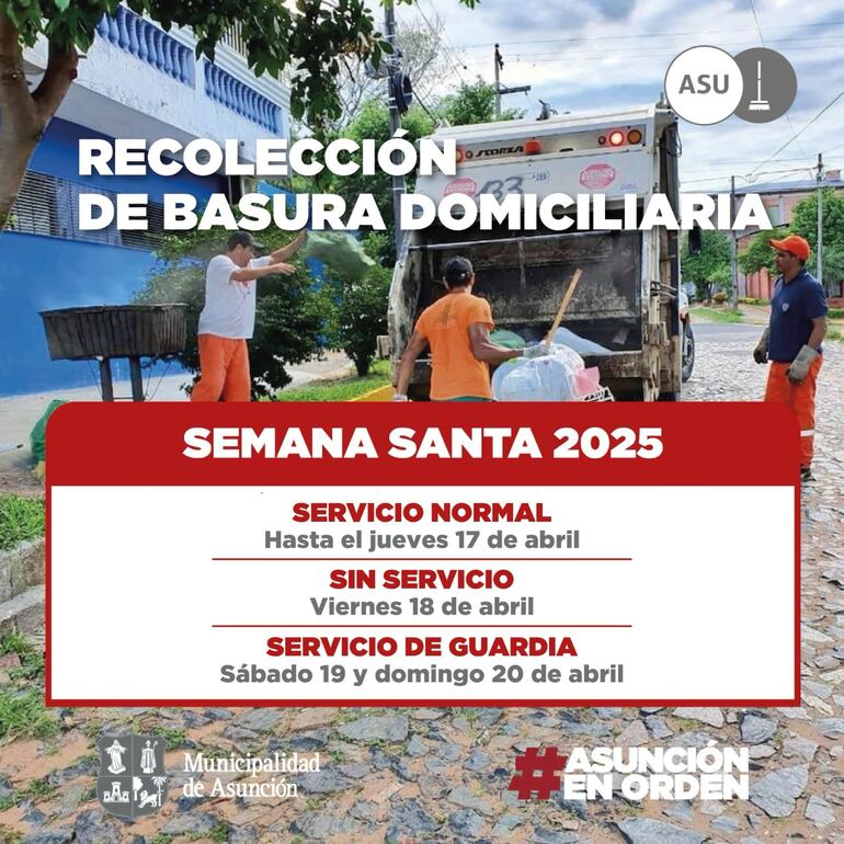 Desde la Municipalidad de Asunción, como todos los años, en Semana Santa, instan a la ciudadanía a no sacar la basura los días en que el servicio permanecerá suspendido.