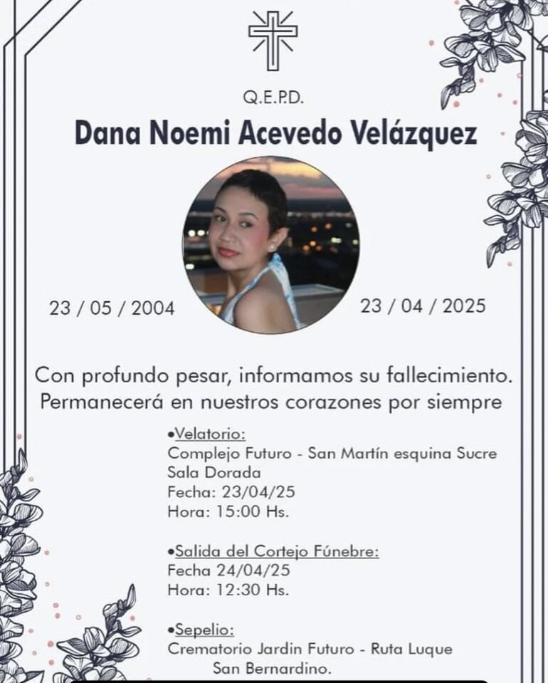 El velatorio se realiza en la Sala Dorada del Complejo Futuro, ubicado sobre la avenida San Martín. La salida del cortejo fúnebre está prevista para este jueves a las 12:30. Dana será cremada en el Jardín Futuro, sobre la ruta Luque - San Bernardino.
