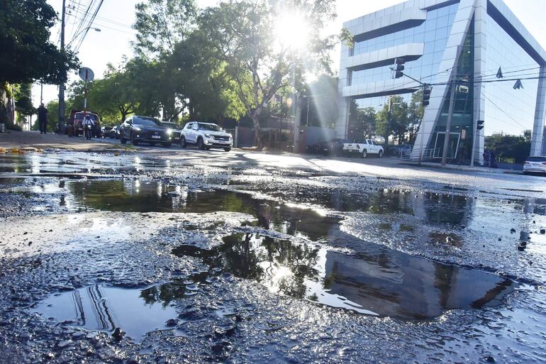 En esta esquina, un caño roto inunda de agua la zona y genera enormes baches, tanto sobre Kubitschek como sobre Herminio Giménez. La presencia del agua, además, torna más difícil la visibilización de los cráteres que se forman en la capa asfáltica.