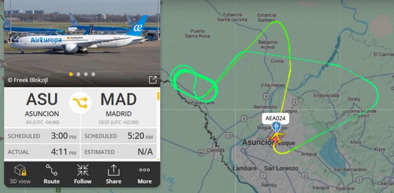 El director de Aeropuertos de la Dirección Nacional de Aeronáutica Civil (Dinac), Rubén Aguilar, explicó que el avión involucrado es un Boeing 787-900. “A los diez minutos del primer despegue, el piloto declaró una alerta ‘pan-pan’, que es una señal de prioridad ante fallas técnicas no críticas. Informó que retornaría al Silvio Pettirossi, pero antes debía liberar combustible, por eso ascendió a unos 4.000 metros de altura”, relató.