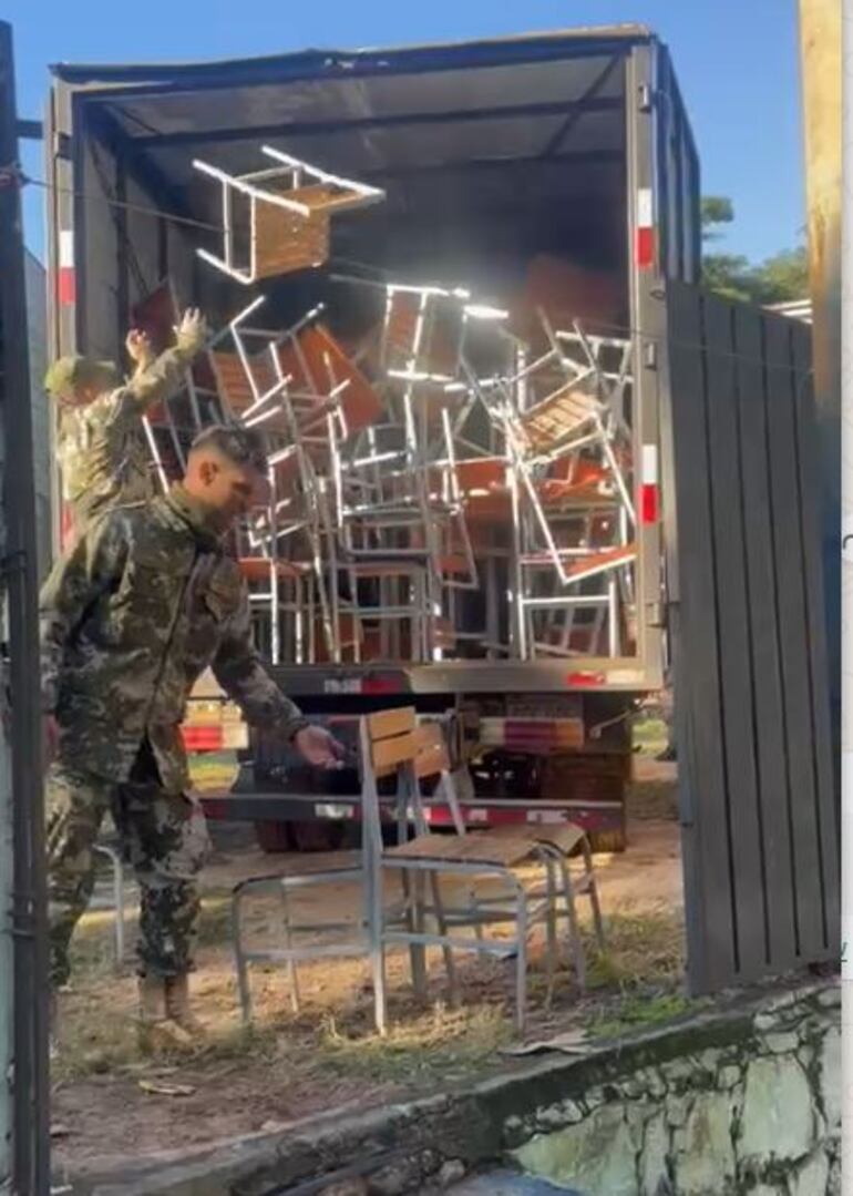 Según el reclamo, los militares “tiraron” todas las sillas pedagógicas que encontraron en el centro educativo para encimarlas en un pequeño camión, pese a que el mobiliario es nuevo. Estos muebles fueron entregados a principios del año lectivo por la Gobernación de Central, a cargo del gobernador Ricardo Estigarribia (PLRA).
