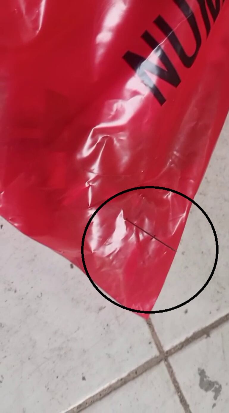 En las imágenes compartidas se observa cómo el objeto punzante atravesó el material de la bolsa destinada a residuos patológicos.