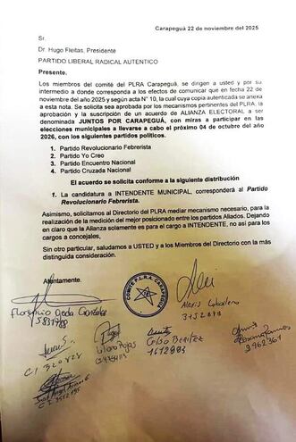 Según el documento enviado al presidente del PLRA, Hugo Fleitas, el comité local solicitó aprobar la suscripción de la alianza “Juntos por Carapeguá”. El acuerdo preliminar plantea que la intendencia quede por el PRF, mientras que las listas de concejales se presenten de forma individual por cada partido.