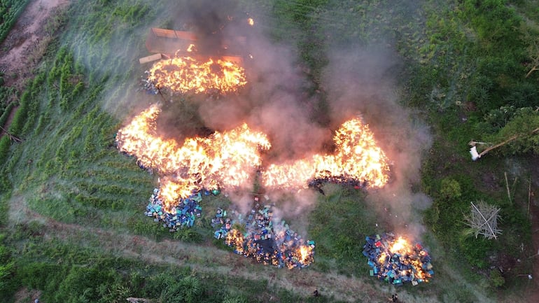 La carga fue trasladada hasta una ubicación rural en la colonia Gasory, departamento de Canindeyú, donde, con la presencia de representantes del Poder Judicial, el Ministerio Público y la Defensoría Pública, y la participación de personal del Laboratorio Forense de la Senad, se procedió a la extracción de muestras, análisis, pesaje y posterior incineración total de la sustancia.