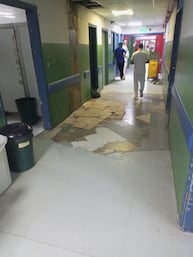 Según las imágenes compartidas, una de las áreas más deterioradas es el cuarto piso, correspondiente a Clínica Médica. Las paredes presentan suciedad acumulada y partes del piso están completamente rotas e intransitables. En ciertos sectores incluso se colocaron cartones para cubrir filtraciones por goteras.
