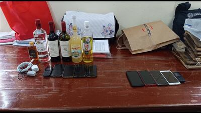 Además de los celulares, los intervinientes incautaron cargadores y varias botellas de bebidas alcohólicas que tenía en su celda el usurero condenado a 15 años de pena privativa de libertad.