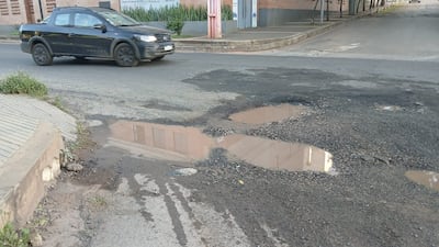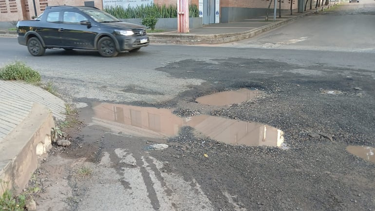 La avenida Laguna Grande, esquina Río Paraguay, tiene grandes y profundos baches que dificultan el tránsito a diario. Los pozos hoy están llenos de agua acumulada y ponen en riesgo sobre todo a los motociclistas. “Es un peligro como está”, lamentó uno de ellos en vivo para ABC TV.