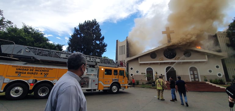 El intendente de Ciudad del Este, Daniel Pereira Mujica, se hizo presente en el lugar y calificó la situación como “muy triste”. “Es el centro espiritual de la ciudad, un ícono histórico y patrimonial. Ojalá los bomberos puedan contener el fuego, pero se nota que está bastante fuerte”, expresó.