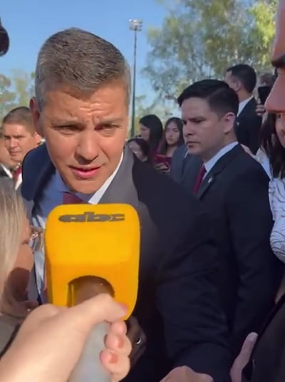 Un video captó al Presidente evitando las consultas de la prensa, fuertemente rodeado de sus escoltas. Solo se detuvo a escuchar, tomarse fotos y responder escuetamente a quienes lo felicitaban.
