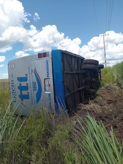 Un colectivo de la empresa Transporte y Turismo Ligero (TTL) volcó ayer en el Kilómetro 72 de la ruta PY22, en el distrito de San Alfredo. Según el conductor del transporte público, Wilson Gustavo Peña, de 52 años, un bache ubicado en la ruta provocó el desprendimiento de la barra de dirección.