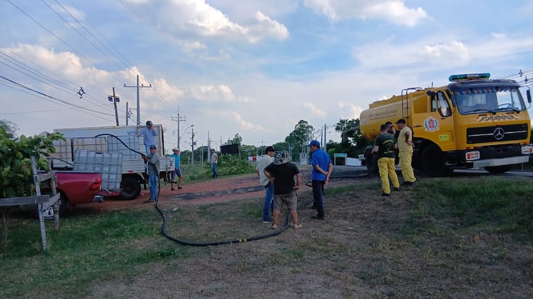 Ante la ausencia de una solución oficial inmediata, la provisión de agua se logró mediante gestiones locales y aportes privados. Un carro hidrante del Cuerpo de Bomberos Voluntarios de Pilar trasladó 15.000 litros de agua hasta la comunidad, con apoyo de otros tres camiones que distribuyeron bidones casa por casa.