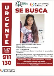 El sábado a las 22:00 aproximadamente fue vista por última vez Ruth Jazmín Martínez Cardozo, de 13 años, en el barrio Inmaculada de Concepción.