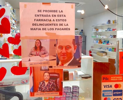 En una hoja impresa colocó las imágenes de los presuntos implicados. Entre ellos, la exjueza de Paz de Luque, Norma Beatriz Ortiz Díaz, y los abogados Zully Ortiz García y Milcíades Toledo Morínigo. Sus nombres aparecen como epígrafe junto al título: “Se prohíbe la entrada en esta farmacia a estos delincuentes de la mafia de los pagarés”.