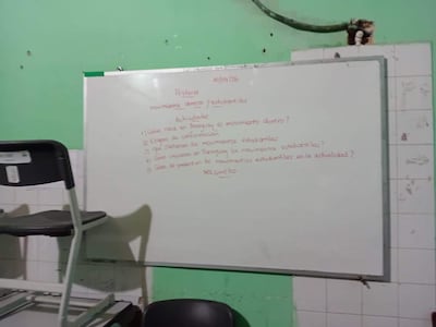El lugar presenta condiciones inadecuadas: aunque se retiraron los elementos propios de un baño y se instaló una pizarra, aún se observan azulejos en las paredes.