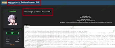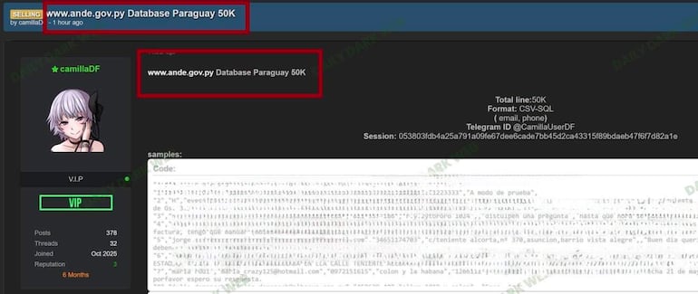 Una página denominada “Dark Web Ingelligence” dio a conocer a través de la red social “X” que “un actor de amenazas está anunciando una base de datos supuestamente con ANDE (Administración Nacional de Electricidad), el proveedor nacional de electricidad de Paraguay”.