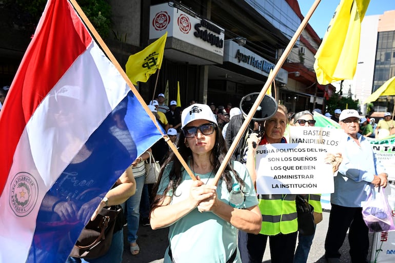 Más de 200 docentes de escuelas públicas, asegurados y jubilados del Instituto de Previsión Social (IPS) protestaron esta mañana frente a la Caja Central de la previsional, exigiendo la salida de su presidente, Jorge Brítez, y de todo el consejo directivo.