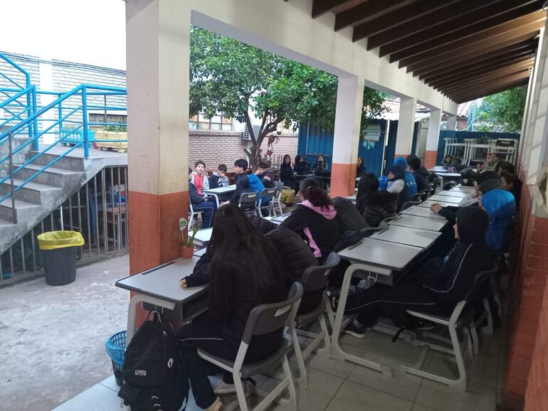 Obras inconclusas en las aulas del colegio Las Residentas de Luque obligan a que los alumnos del séptimo, octavo y noveno grado desarrollen sus clases a la intemperie.