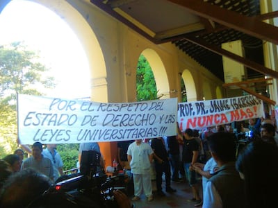 Uno de los estudiantes comentó que presentaron una sentencia de la Corte en la cual se señala que la destitución de Espínola fue irregular; sin embargo, el Consejo de esta casa de estudio desestimó los documentos en los cuales se puntualizaba el mal proceder de Ibarrola.