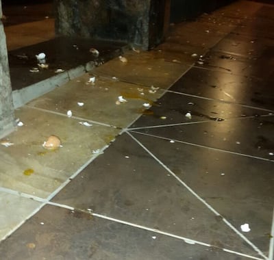 En las imágenes de las cámaras de seguridad se puede apreciar el momento exacto en que dos personas llegan hasta la vivienda del decano y empiezan a bombardear con huevos la fachada, ataque que duró unos pocos segundos. Uno de los atacantes tapó la lente de una cámara antes de iniciar su fechoría para evitar que fueran identificados.