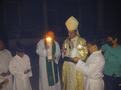 La celebración religiosa de la Vigilia Pascual comenzó esta noche en la Catedral de Fuerte Olimpo ante una gran cantidad de feligreses, con la bendición del fuego y el encendido del cirio pascual. Prosiguió con una pequeña procesión frente a la explanada del templo, con las velas encendidas por las personas, para finalmente ingresar al interior de la iglesia, donde prosiguió la misa central.