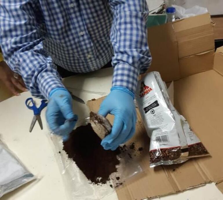 La encomienda ya había sido retenida días atrás y esta mañana se procedió a la apertura ante la jueza Rosarito Montanía, en la oficina de atención permanente del Palacio de Justicia, en Sajonia. Agentes de la Senad extrajeron la cocaína oculta de uno de los paquetes de café que estaban en la caja incautada.