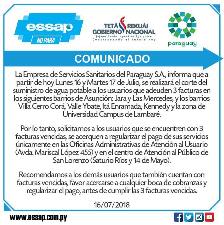 A través de un comunicado, la aguatera estatal anunció que procederá al corte en barrios como Jara y Las Mercedes. En Lambaré también estarán recorriendo Villa Cerro Corá, Villa Ybaté, Itá Enramada y Kennedy, entre otras.