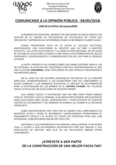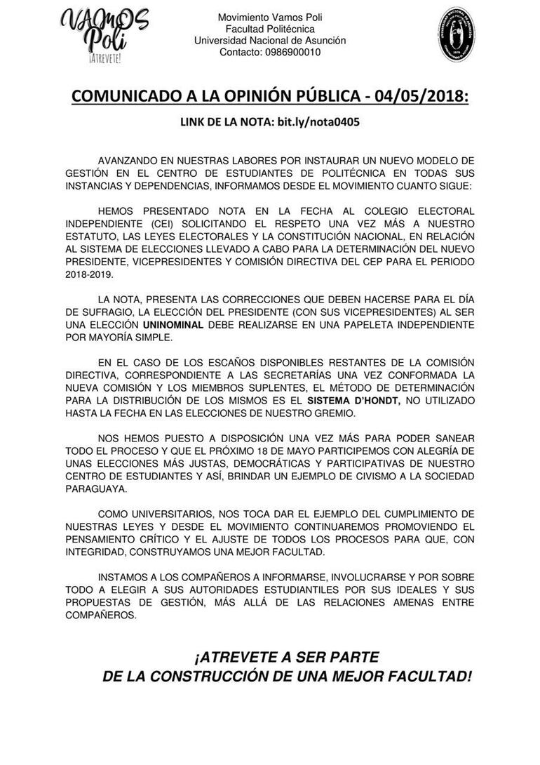 En un comunicado emitido por el Movimiento Vamos Poli, informan al estudiantado que se pusieron a disposición una vez más para poder sanear todo el proceso y que el viernes 18 de mayo participen sus pares, con alegría, de unas elecciones más justas, democráticas y participativas. Todo, con el fin de brindar un ejemplo a la sociedad paraguaya.