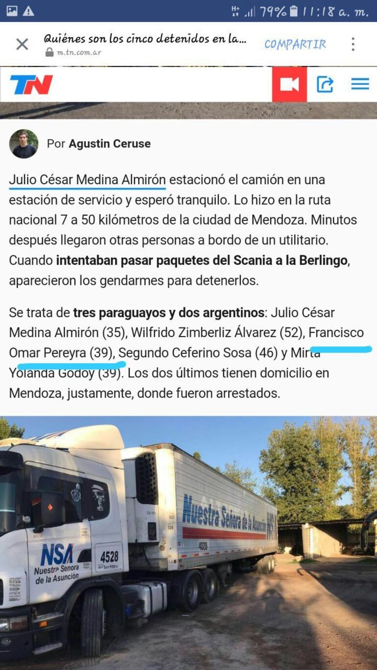 En dicho procedimiento, fue detenido el conductor de un camión de gran identificado como Julio César Medina Almirón. Además de Wilfrido Zimberliz Álvarez (52), Francisco Omar Pereira (39), docente con domicilio en la ciudad de San Juan Nepomuceno; Segundo Ceferino Sosa (46) y Mirta Yolanda Godoy (39). Los dos últimos tienen domicilio en Mendoza, justamente, donde fueron arrestados.