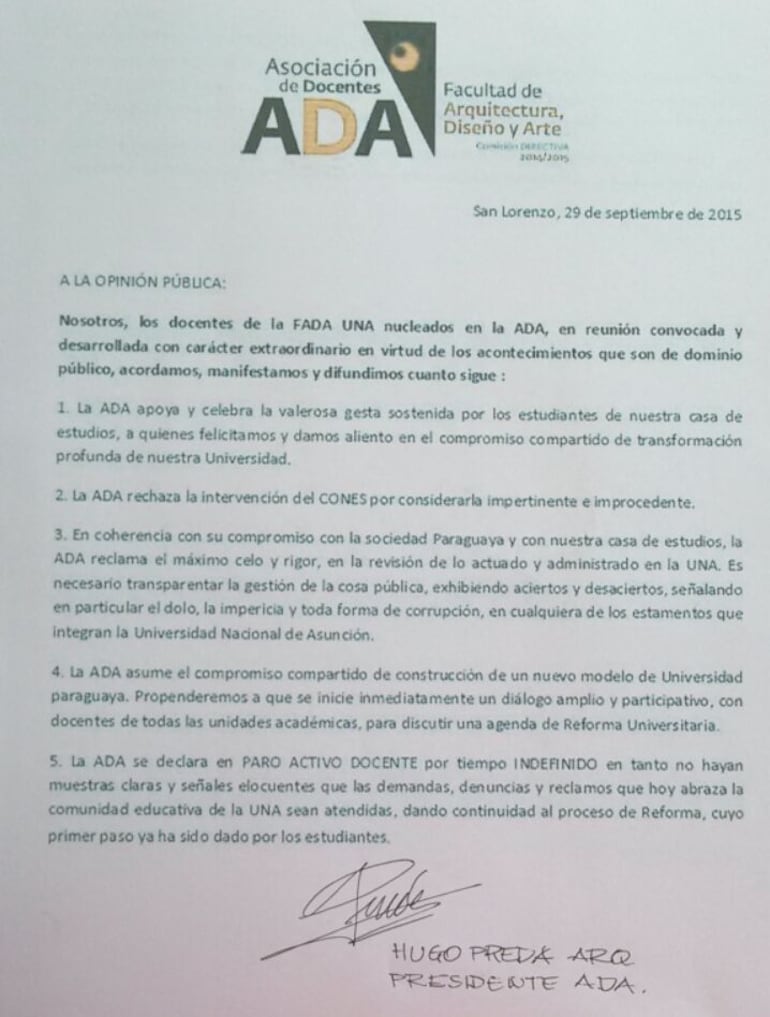 Finalmente, los docentes de la FADA también rechazan la intervención anunciada por el Consejo Nacional de Educación Superior (Cones).