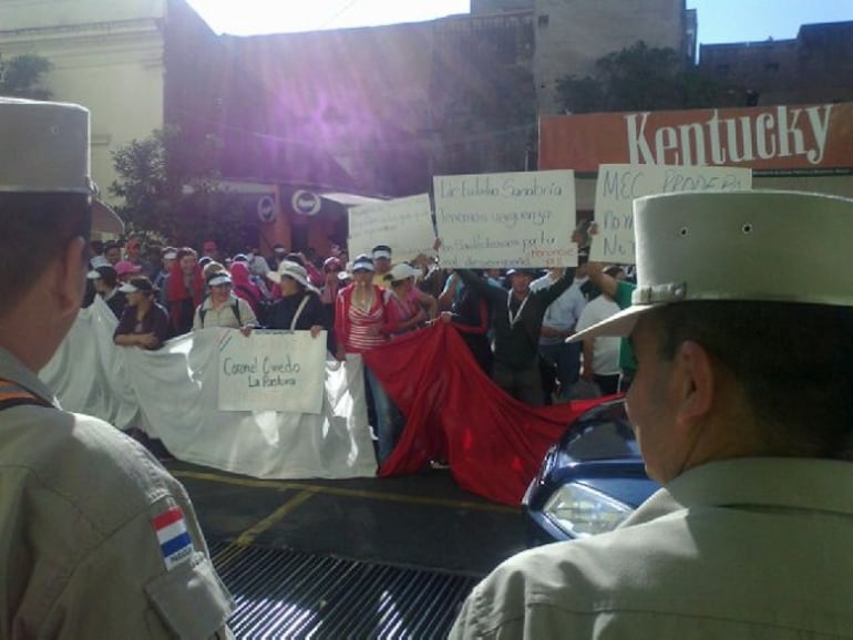 Los maestros se concentran desde tempranas horas en las plazas frente al Congreso, en espera del inicio de la sesión en el Senado, que en la fecha debe estudiar la modificación del artículo 39 de la Ley Nº 4581/11 ‘Que aprueba el Presupuesto General de la Nación para el Ejercicio Fiscal 2012", lo que permitirá el pago de bonificación a los docentes por el segundo hijo.