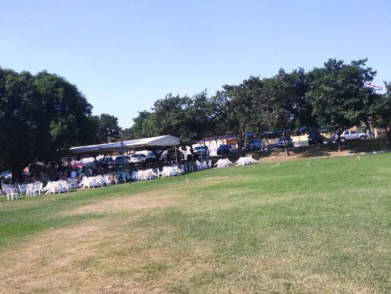 En el patio de la Dirección de Material Bélico se pudo ver una gran cantidad de sillas blancas y mesas con manteles, todo elegantemente acomodado para el almuerzo.