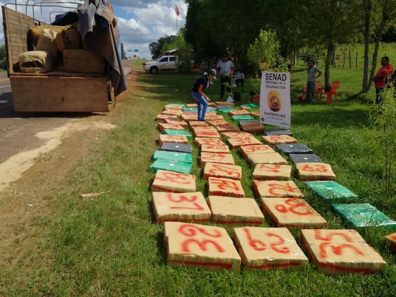 Los intervinientes verificaron el camión por disposición de la fiscala Fátima Villasboa y detectaron una gran cantidad de bolsas que contenían marihuana prensada en la carrocería. Los intervinientes detuvieron al conductor del rodado, quien fue identificado como Francisco Servín Palacios (50).
