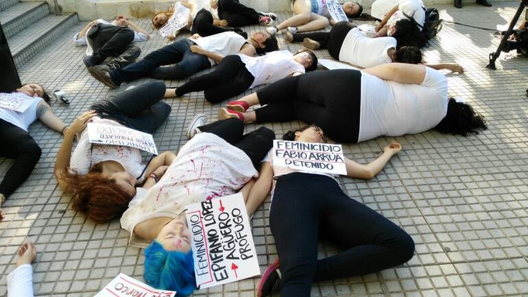 Desde tempranas horas, un grupo de mujeres se preparó frente al Palacio de Justicia para la performance que dio inicio a la semana previa al Día Internacional contra la Violencia hacia la Mujer, que se recuerda el 25 de noviembre. Con carteles con el nombre de los feminicidas, se tiraron en el piso, como las víctimas fatales de los casos que se han dado a conocer este año y que han quedado impunes.