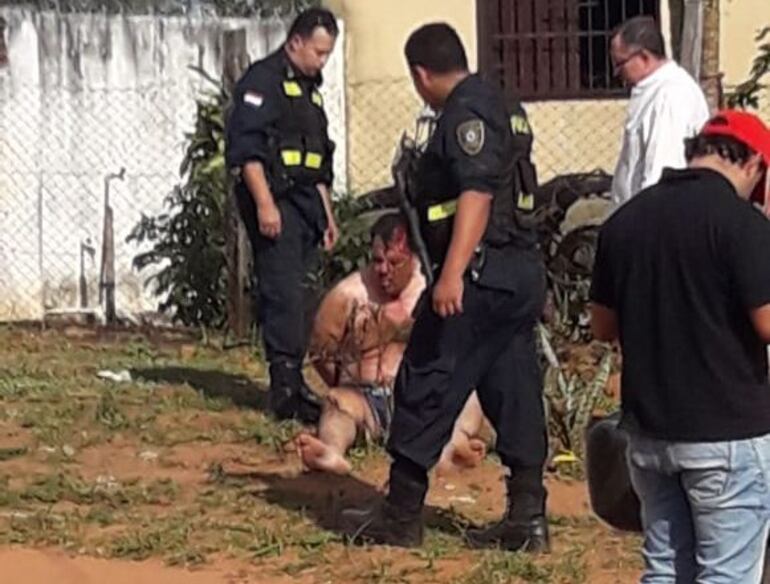 "El mismo tenía un arma blanca en mano, un cuchillo, según manifestó al concubina, la estaba persiguiendo en por el patio con dicha arma. Al llegar nosotros quisimos dialogar primeramente con él, pero desde un principio reaccionó por nosotros, diciendo que nos iba a acuchillar si ingresamos a su casa. No tuvimos otra opción que utilizar ya la fuerza", insistió el policía.