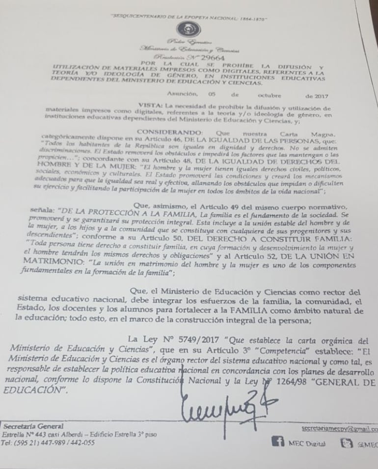 La resolución n.° 29664 del MEC, emitida el 5 de octubre del corriente año, prohíbe la difusión y utilización de materiales impresos como digitales referentes a la teoría o "ideología de género" en las instituciones dependientes de esta cartera estatal.
