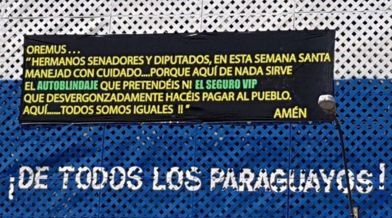 “Hermanos senadores y diputados, en esta Semana Santa manejad con cuidado… porque aquí de nada sirve el autoblindaje que pretendéis ni el seguro VIP que desvergonzadamente hacéis pagar al pueblo. Aquí todos somos iguales”, reza el mensaje en una pancarta negra en la fachada del hospital.