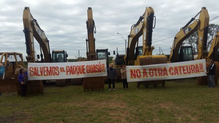 “No nos olvidamos del Parque Guasu” es la frase que intentan hacer llegar a las autoridades los manifestantes en el Parque Guasu Metropolitano. A las 11:00 colocaron pancartas dentro y fuera del lugar.
