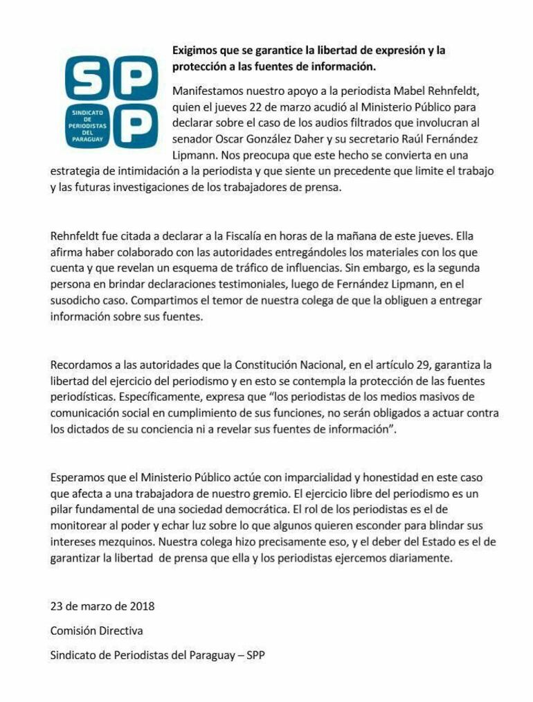 En primer lugar, el Sindicato de Periodistas del Paraguay manifiesta su apoyo a la periodista Mabel Rehnfeldt, quien acudió hoy al Ministerio Público para declarar sobre el caso de los audios filtrados que involucran al exsenador Óscar González Daher y Raúl Fernández Lippmann.
