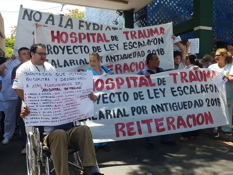 El Hospital de Trauma “Prof. Dr. Manuel Giagni” cuenta con más de 1.500 funcionarios, entre doctores, enfermeros y administrativos. Estos solicitan un aumento salarial por escalafón profesional para 2018, lo que fue rechazado ayer en la Cámara de Diputados por 39 legisladores, razón que los llevó a manifestarse esta mañana.