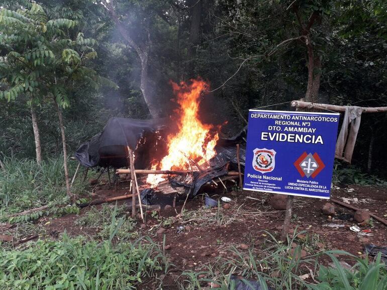 Por orden del fiscal interviniente se procedió a la incineración de los siete campamentos y de toda la marihuana destruida. El procedimiento comenzó a tempranas horas de este miércoles y culminó a las 17:00.
