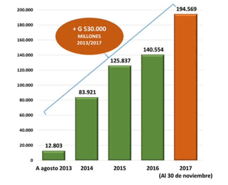 La SET reporta que la recaudación del IRP alcanzó a noviembre de 2017 la suma de G. 195.000 millones, lo que representa un crecimiento del 38,5%. Destaca, asimismo, que La SET recolectó más de G. 530.000 millones en los últimos cuatro años respecto de lo ingresado hasta agosto del año 2013.