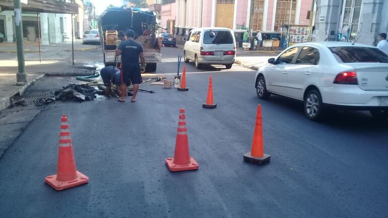 La Municipalidad de Asunción ejecuta una obra de repavimentación sobre esta arteria, en el centro. Se inició en la esquina del Palacio de López y ya avanzó hasta Estrella. La intervención por una cañería rota es a la altura de la calle Palma, hasta donde hace menos de 24 horas llegó el nuevo asfalto.