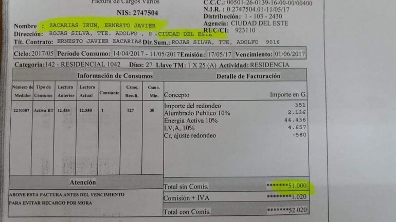 La factura que está a nombre de Zacarías Irún corresponde a una vivienda de Ciudad del Este, ubicada en el barrio Pablo Rojas, y el monto por el ciclo de consumo del 14 de abril de 2017 al 11 de mayo de 2017 es de solo G. 52.020.