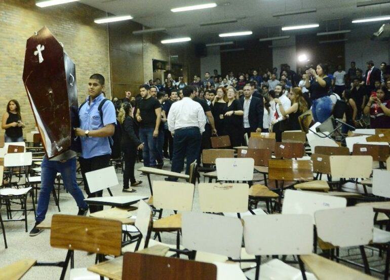 La marcha fúnebre de los chicos de estos movimientos desató la furia de algunos estudiantes presentes en la ceremonia de asunción y, así, se inició una batalla campal. Solo en este año, ya se dieron dos moquetes dentro de esta facultad, pues hace unas semanas, las elecciones de delegados para el quinto semestre de la institución fueron suspendidas a causa de una violenta trifulca entre algunos alumnos.