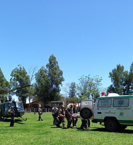 Tras el enfrentamiento con los presuntos miembros del EPP, Gómez Riquelmen fue derivado por vía aérea al Hospital Genral de Santa Rosa del Aguaray, donde se constató que cuenta con dos orificios de entrada de proyectil en el lado derecho del abdomen y sin orificios de salidas, conforme a datos de la Policía.
