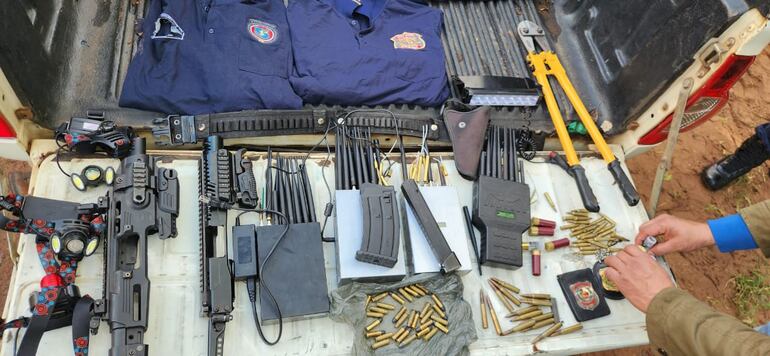 Además, se incautaron cartuchos de diversos calibres, cargadores de escopetas, un cinturón con revólver, tres linternas mineras, un cortador de cadena y un teléfono celular.