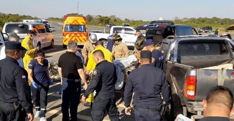 Se hicieron presentes los dos cuerpos de Bombero Voluntarios del Paraguay tanto azules como amarillos y en forma conjunta realizaron el trabajo de rescate del cuerpo de la víctima fatal, que quedó atrapado en la cabina de la camioneta entre los hierros retorcidos. Los voluntarios utilizaron una pinza hidráulica para rescatar a la víctima.