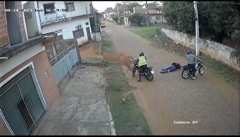 Tras el impacto, esta cayó al empedrado con su motocicleta. Es así que en el video se ve que el hombre que iba de acompañante tenía un arma de fuego en su mano. El mismo fue quien se apoderó de la otra motocicleta, luego de disparar a su víctima, y posteriormente ambos se dieron a la fuga.